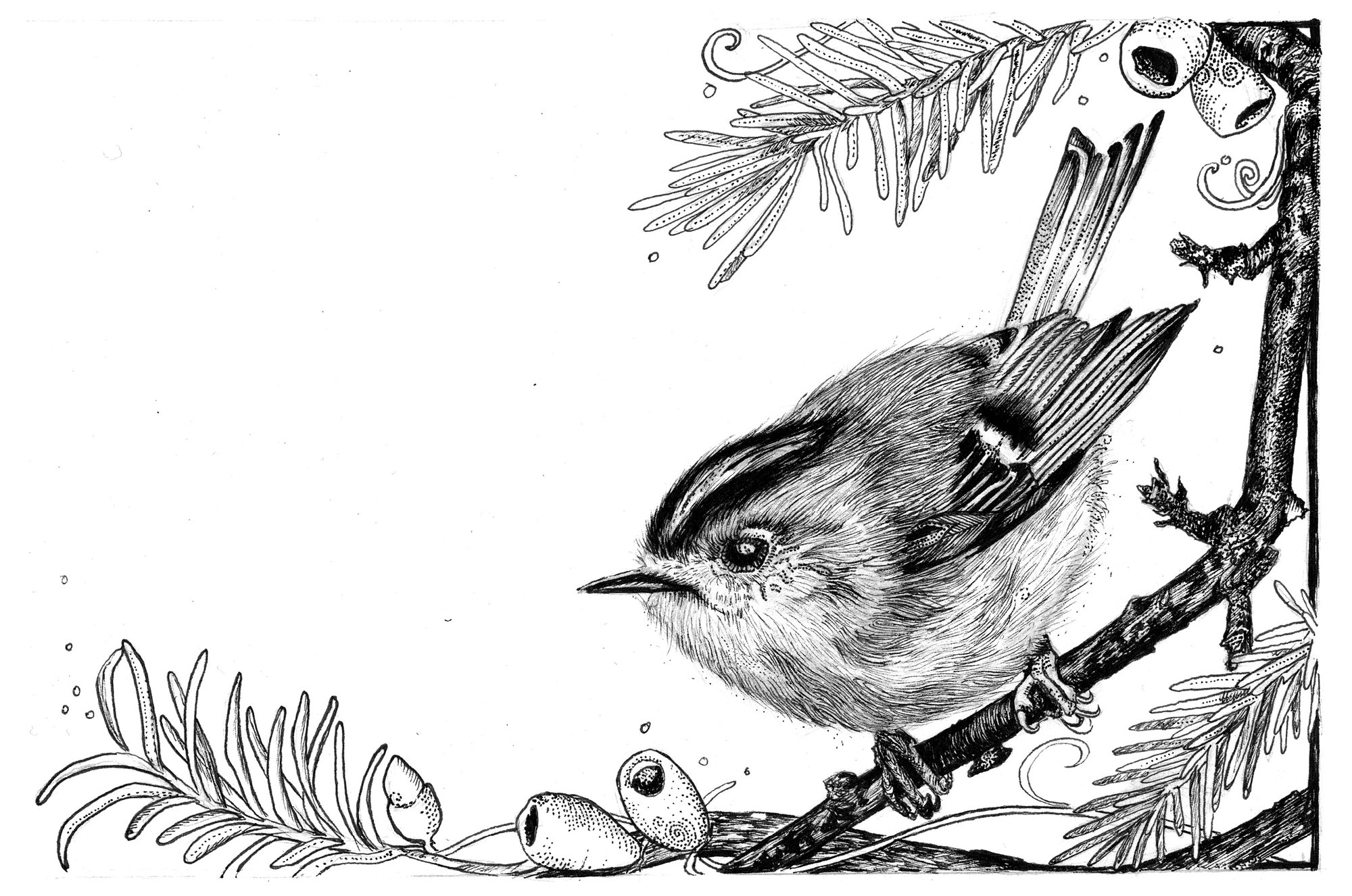 Golcrest with yew. Printed in my home studio with archival pigment ink on beautiful, velvety, matt, heavy cotton rag/eco-hemp fine art papers. Collectable and look great in a set of similar sized prints.