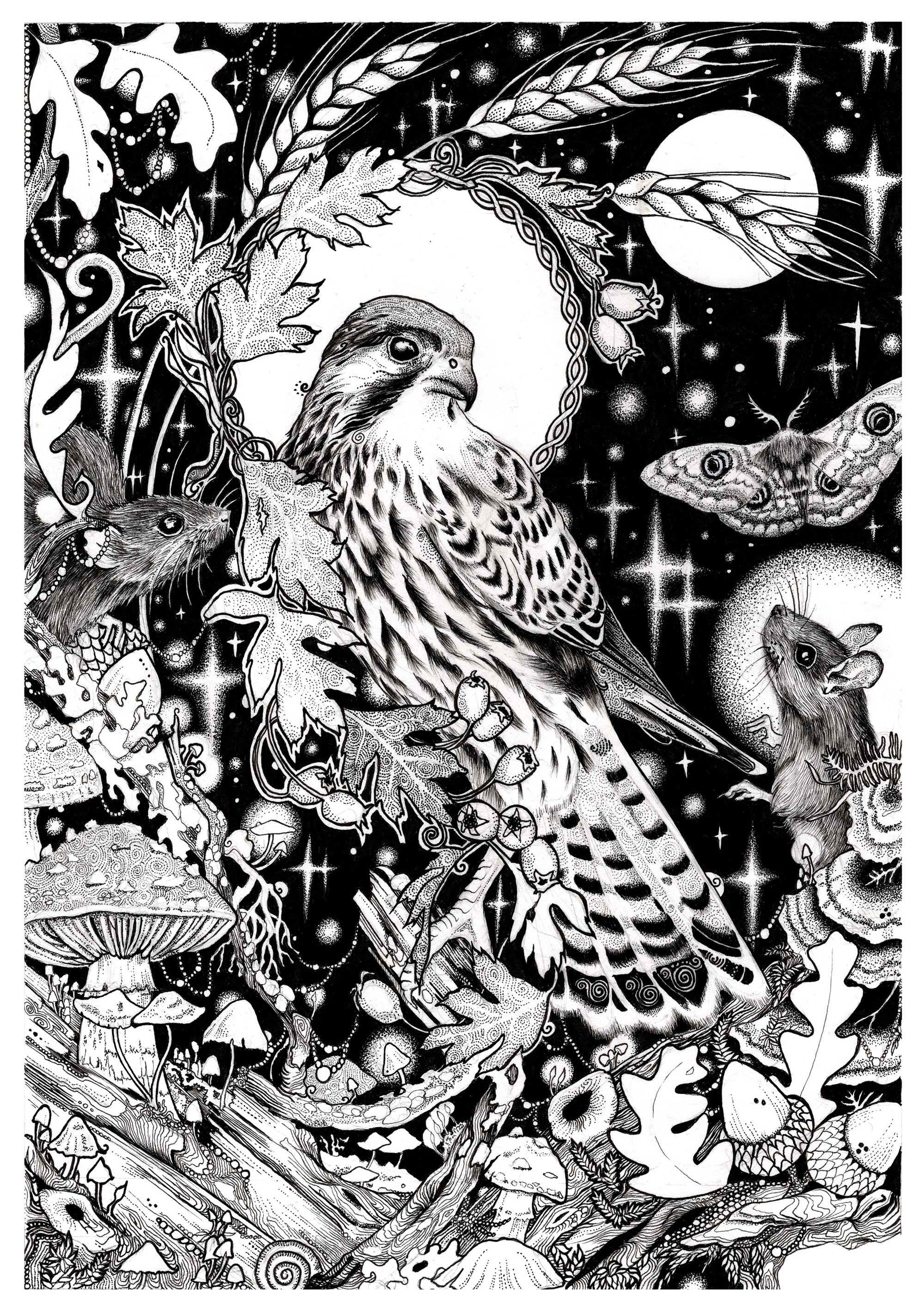 Ltd edition Fine art print on a beautiful fine art paper. This female kestrel was originally handdrawn in my home studio. The Irish for Kestrel is Pocaire Gaoithe or "wind romper". She frolics aand hovers on the wind as he hunts her prey. It is thought that these small raptors can see a certain part of the UV spectrum that allows them to see urine trails of rodents, which helps them track their prey. kestrels mate for life, but at the moment, due to declining habitats, they only live for 2 or 3 years in the wild.